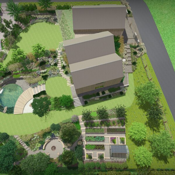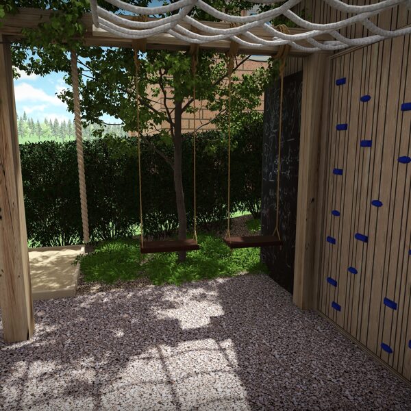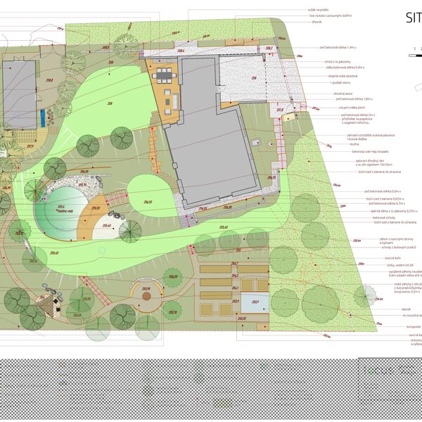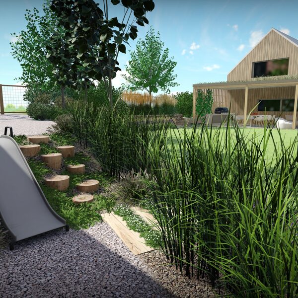 Svažitá zahrada 1500m2 s biotopem a písečnou pláží. Dalšími prvky jsou herna pro děti, ohniště, malá stinná "zašívárna" a užitková část zahrady s malým sadem. Požadavkem bylo rozčlenit zahradu výškově, ale zároveň zachovat možnost případného průjezdu.